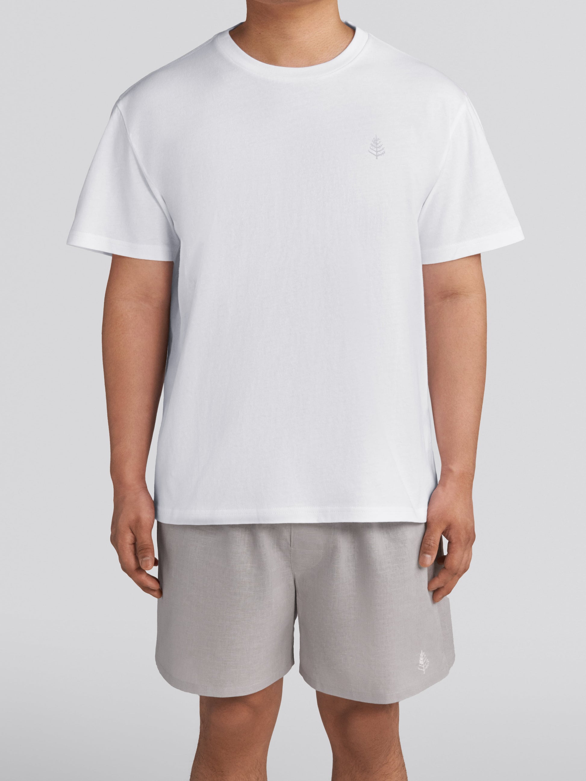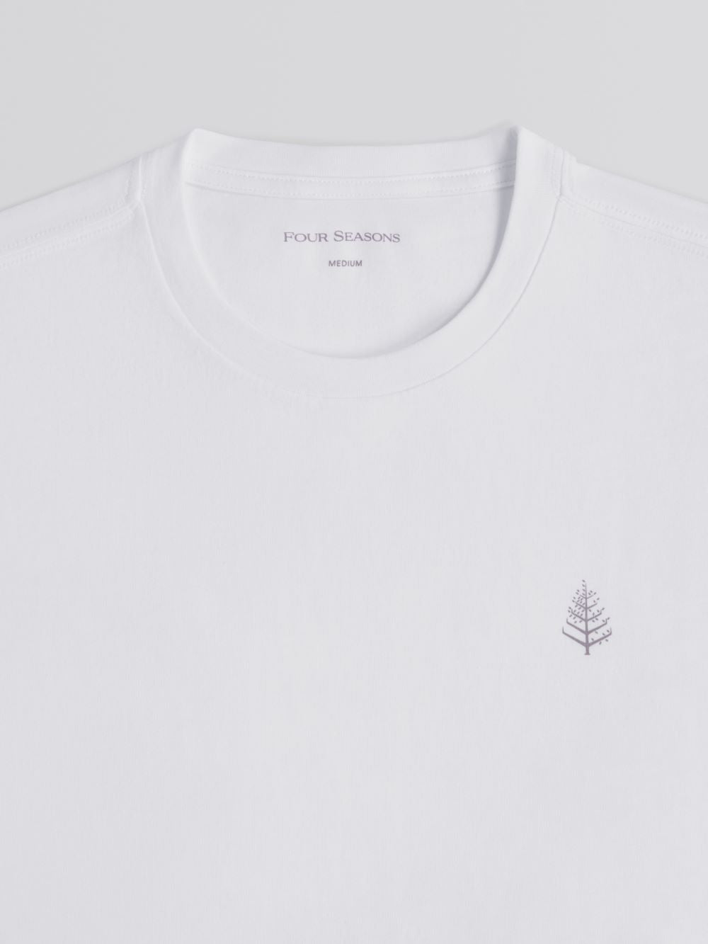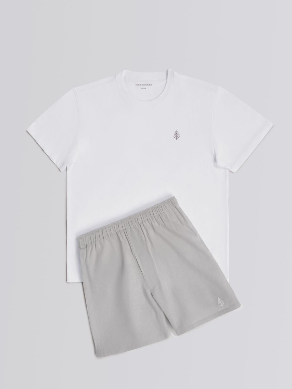 L'ensemble pyjama Resort pour homme est conçu pour se détendre par temps chaud. Il comprend un t-shirt en coton blanc et un short gris en mélange de lin et de coton. Sa taille élastique et ses discrets logos Four Seasons lui confèrent une coupe légère idéale pour les nuits fraîches et les matins ensoleillés.
